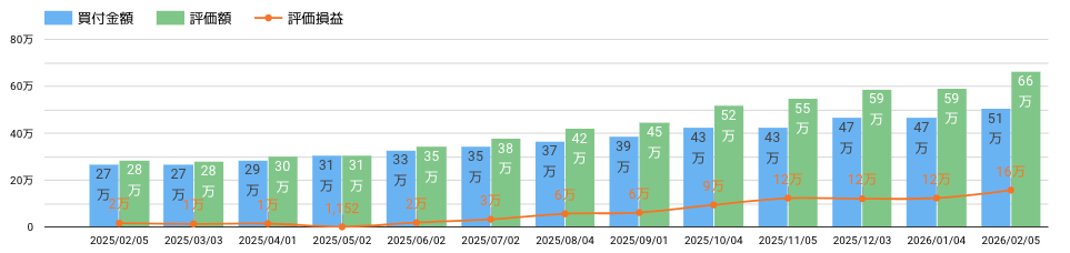 現在の買付金額が約51万円で、+16万円(+31.1%)。