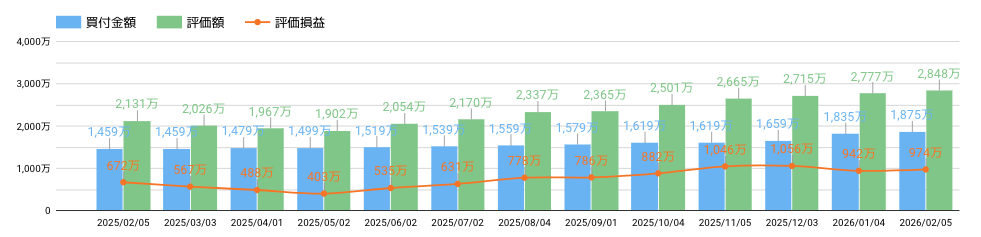 1ヶ月前の評価損益と比較すると+32万円、約1年前と比較すると+302万円となりました。