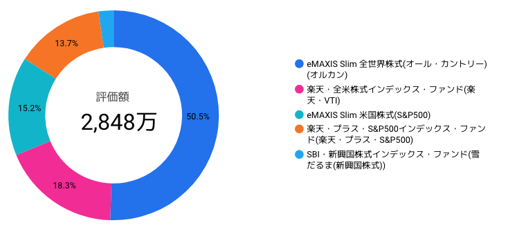 ファンド比率をみると、全世界:50.5%、米国:47.2%(eMAXIS + 楽天S&P500 + 楽天VTI)。