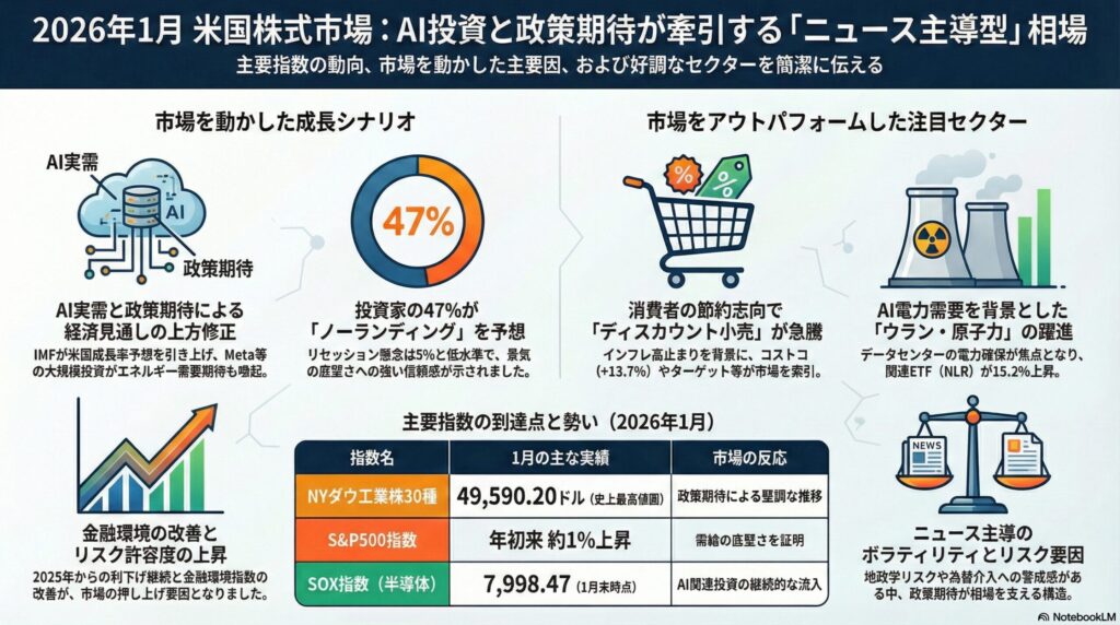 📈 2026年1月の米国株まとめ:激しい値動きも、AIと政策期待で底堅いスタート!