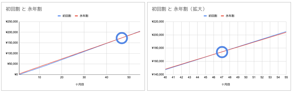 | 経過期間 | 初回割(累計) | 永年割(累計) | 差額(永年-初回) |