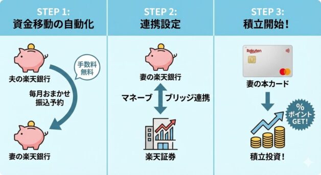 - 夫の楽天銀行から、妻の楽天銀行へ「毎月おまかせ振込予約」を設定(手数料無料枠を活用)