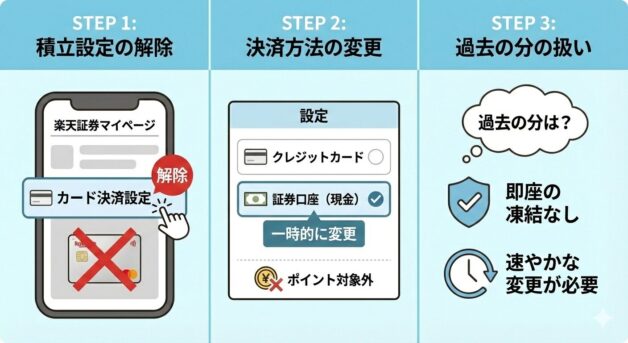 - 積立設定を解除する:楽天証券のマイページから、現在のカード決済設定を一度解除します。